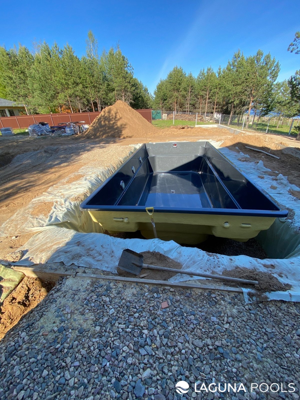 Чаша композитного бассейна с темной внутренней поверхностью установлена на песчаную подушку в котловане на загородном участке.